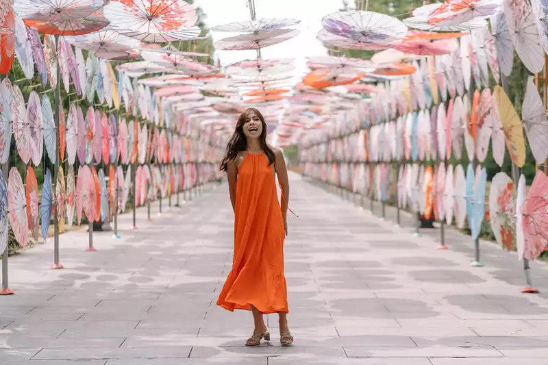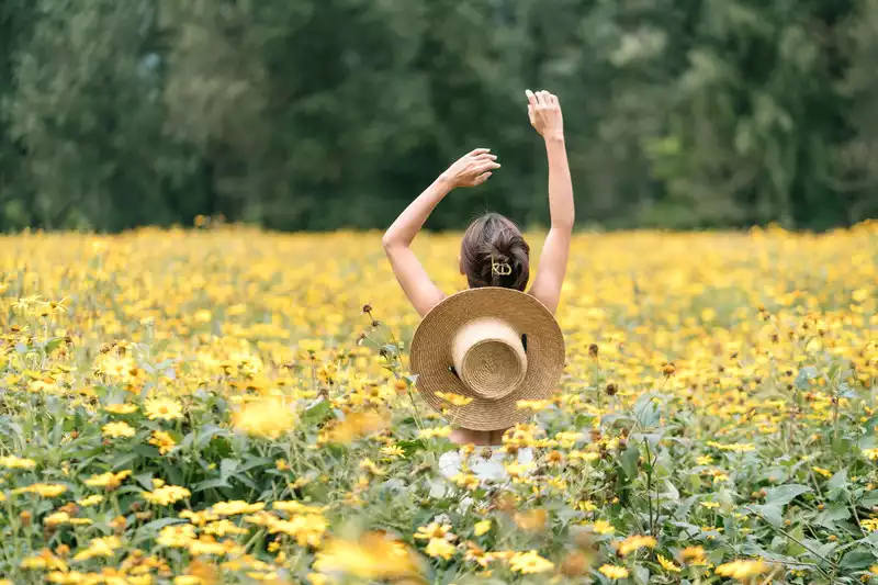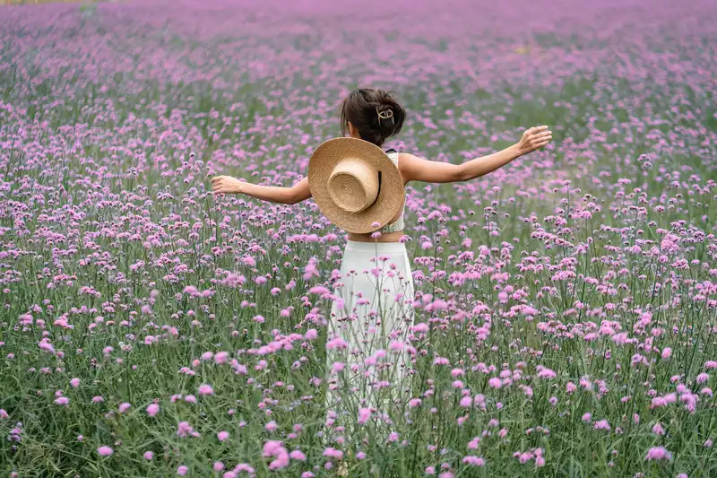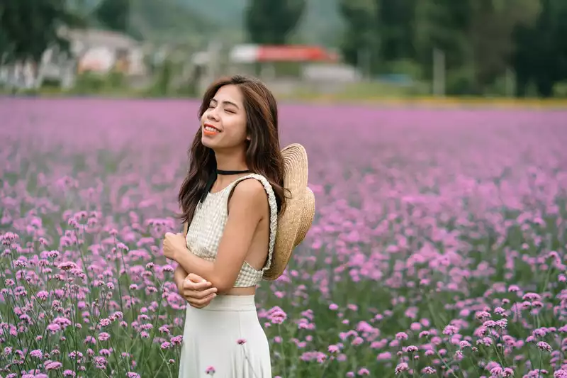 Don’t wear too fancy clothes when taking photos in the sea of flowers. Solid and light-colored clothes are recommended, and a straw hat will make you look more stylish!