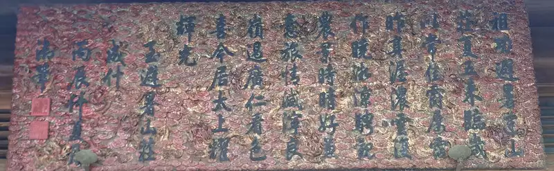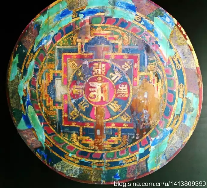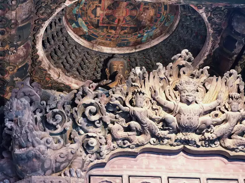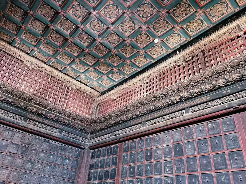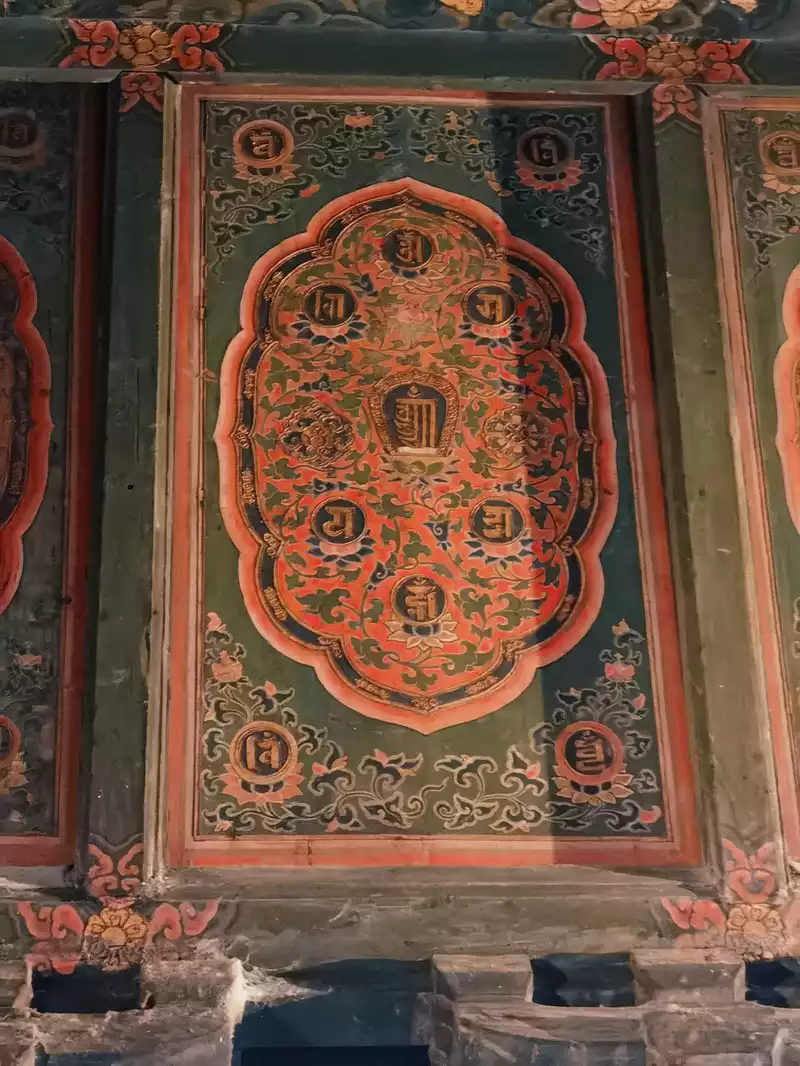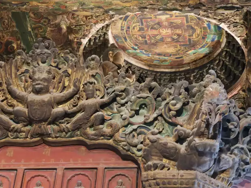 The caisson above the Buddha statue is another unique feature, with exquisite workmanship and meticulous attention to detail. The caisson is cylindrical in shape with a rounded bottom. Its structure slopes upward from the left and right beams. Buddha statues are painted all over the inclined plate. There is a layer of cirrus clouds and lotus petals on the top. There is a circle of circular plates above it like the well mouth. The corners of the plate are also carved with cirrus clouds. There are five layers of small brackets on it. There is a circular plate in the center with a seven-character mantra written on it. The curly grass and lotus petals are decorated with three colors of vermilion, blue and green inside, and are decorated with gold threads. The contrast is strong, the coordination is harmonious, and the craftsmanship is excellent.