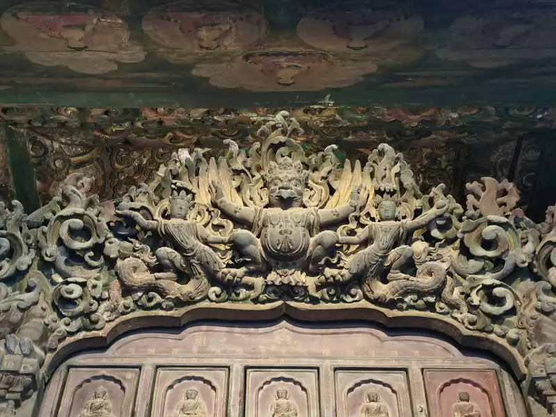 The Garuda, the Dragon Girl, and the Whale carved on the top of the wheel zodiac, as well as the boy's mount, the lion king, and the elephant king on the corner pillars, together form the six holding objects. They are the most common Tibetan Buddhist art images and serve as the backlight for all the reliefs of Sakyamuni on the drawers of each sutra cabinet. In addition to the Dharma decoration of the six holding tools, the Chakravartin also adds Vajras and Bodhisattvas. This wheel collection combines exquisite craftsmanship such as carving and painting, and can be called an artistic treasure of Ming Dynasty architecture.