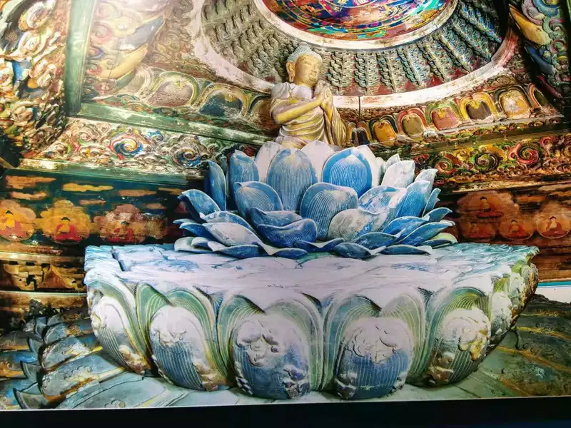 From the complete picture, you can see the Buddha sitting on a Chinese-style lotus platform. The multi-layered lotus petals on his lotus sumeru throne are huge and full, and the carvings and paintings are gorgeous and exquisite.