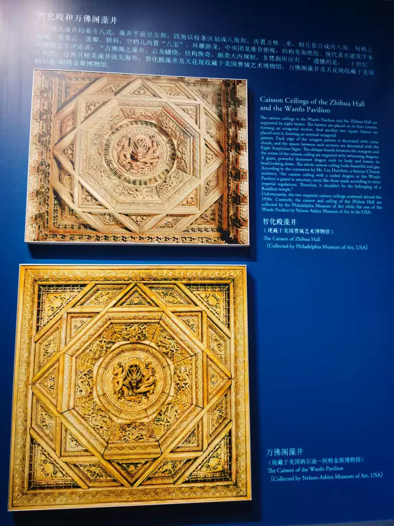 Zhihua Temple originally had three caissons, which were inlaid on the tops of the three groups of buildings: Zangdian, Zhihuadian, and Wanfo Pavilion. Now only the piece in the Tibetan Hall remains, the one in the original Zhihua Hall is in the Philadelphia Museum of Art, and the one in the original Pavilion of Ten Thousand Buddhas is in the Nelson Museum in the United States. We can only rely on viewing pictures to feel the vivid and magnificent shape of the two-sided Douba caisson from a distance.