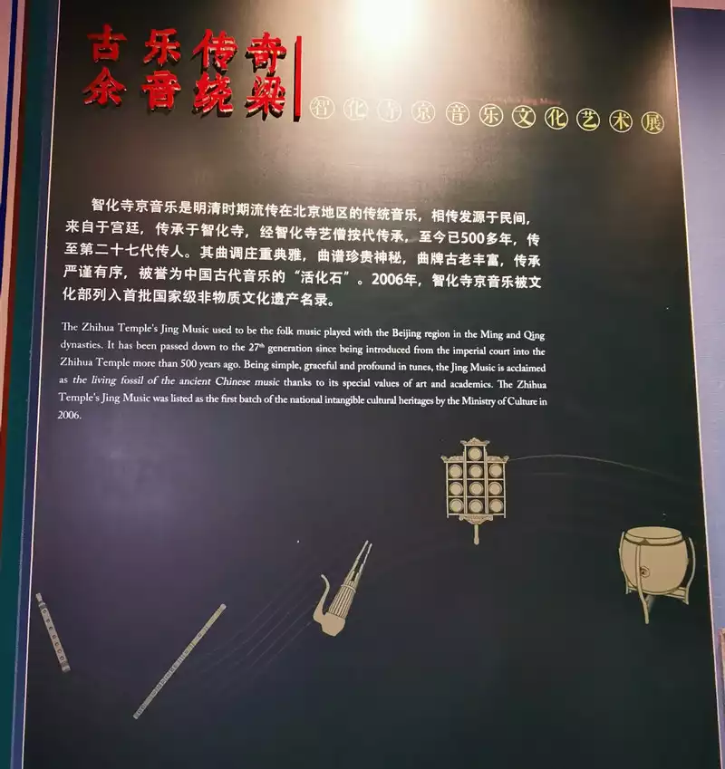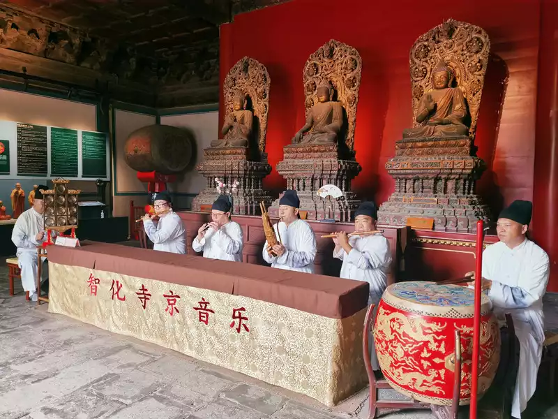 Beijing music is another treasure of Zhihua Temple. It is the only type of ancient music in my country that has been passed down from generation to generation and is well preserved to this day. Since the 11th year of Zhengtong in the Ming Dynasty (AD 1446), it was introduced from the palace to Zhihua Temple. It has been passed down in Zhihua Temple for more than 560 years without interruption, and is now passed down to the 27th generation of descendants. p > < p > The musical notation of Zhihua Temple is based on the ancient Chinese Gongchi notation, which is precious and mysterious. The tunes of Zhihua Temple Beijing Music are simple and elegant, and still retain the legacy of the Tang and Song Dynasties. It is known as the "living fossil of ancient Chinese music" and was included in the first batch of national intangible cultural heritage lists in 2006. p > < p >