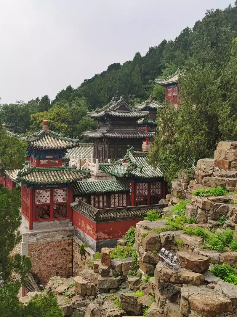 The Summer Palace has mountains and waters, and walking around consumes a lot of energy. We are going from the mountains behind Wanshou Mountain (there are many mountains). We cannot go directly to Foxiang Pavilion from the Sea of Wisdom at the top of the mountain. We need to go down the mountain first and then go up the mountain from the Paiyunmen entrance at the foot of the mountain.