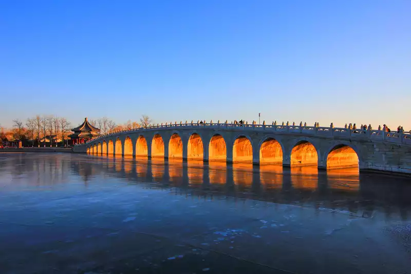 The Seventeen-hole Bridge is located on Kunming Lake, between the East Causeway and Nanhu Island. It is used to connect the causeway island and is the largest stone bridge in the park. The bridge is 8 meters wide, 150 meters long, and consists of 17 bridge holes. There are more than 500 stone lions of different sizes and shapes carved on the railings on both sides of the stone bridge. The ancients mastered and utilized the knowledge of astronomy and geography when building the bridge. When the sun shines at its lowest point in the afternoon around the winter solstice, the sunlight will penetrate the entire bridge hole, presenting a natural wonder of "golden light piercing the hole". This is also a genius stroke of the garden designer. There are only a few days in a year when you can see the wonders, and you have to have good weather and good luck, so let’s feast our eyes on Baidu pictures: