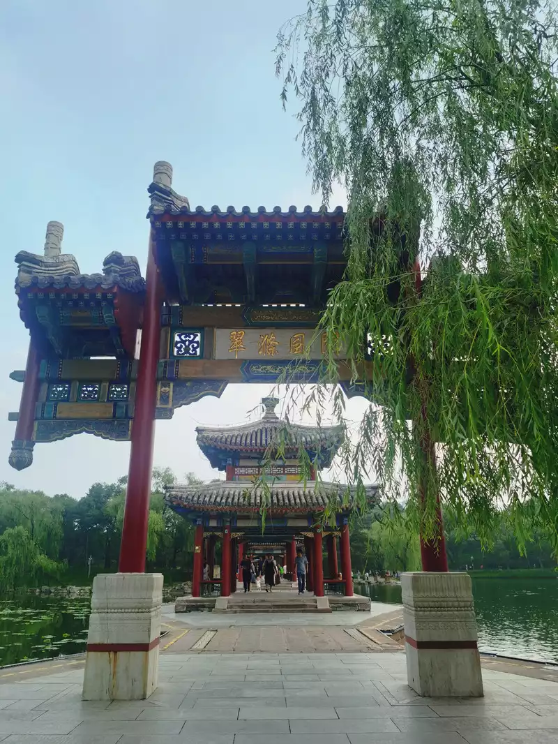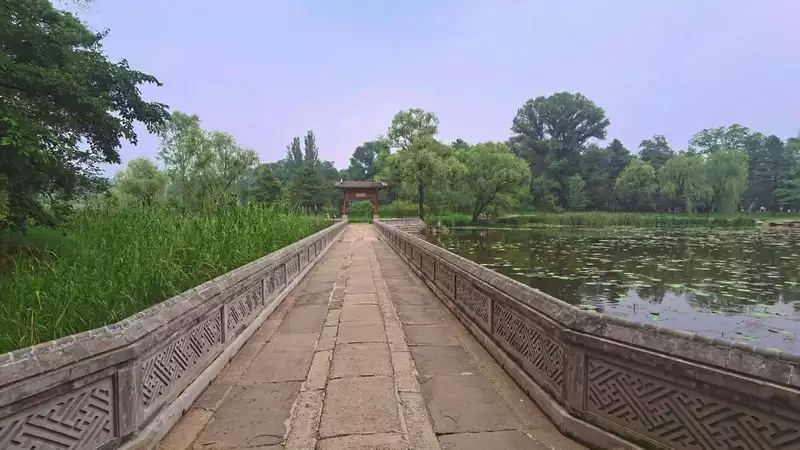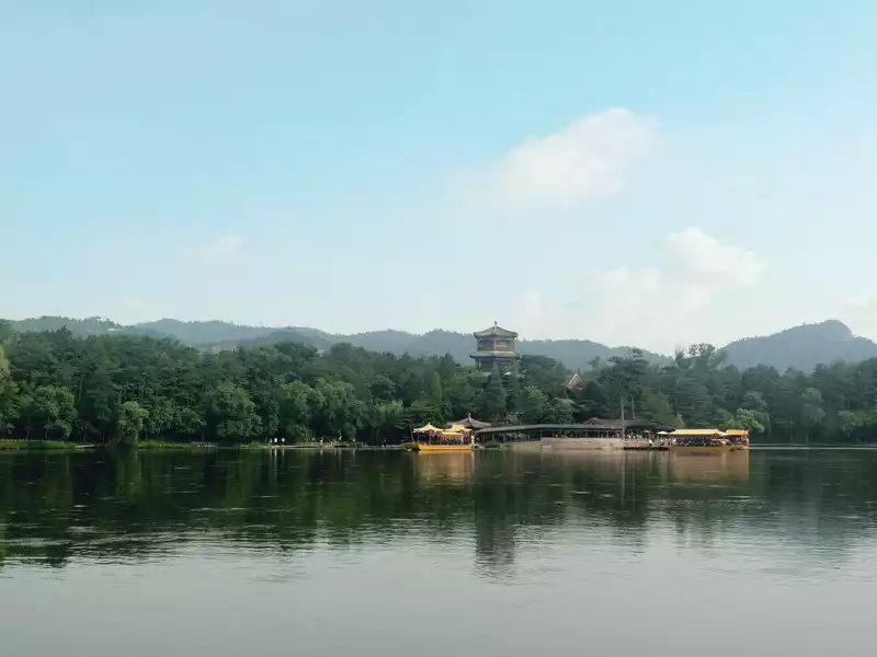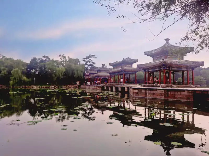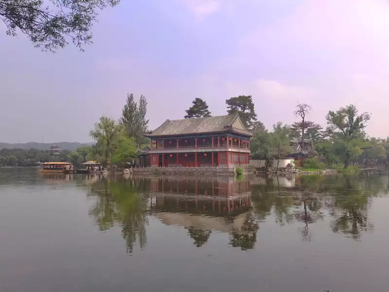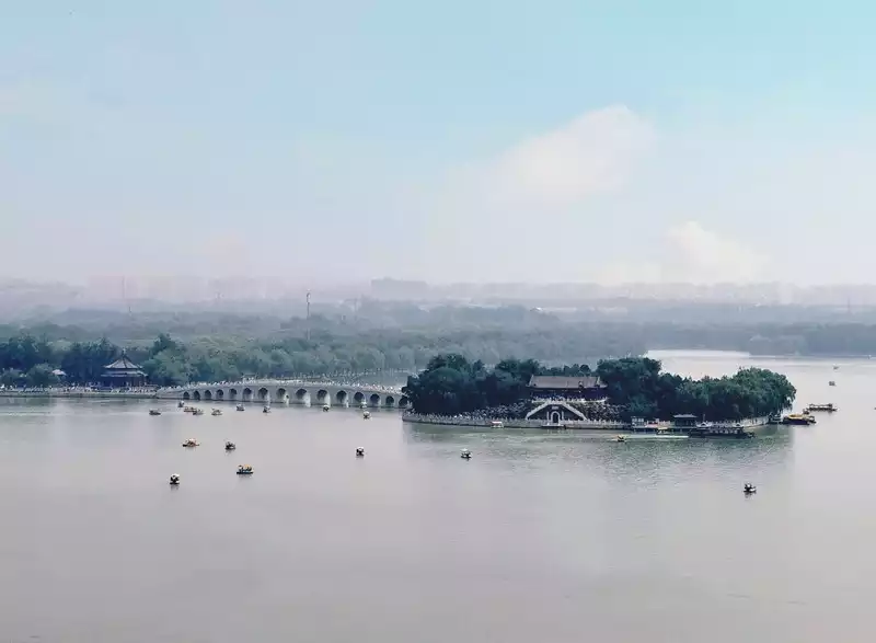 Kunming Lake is the largest lake among the royal gardens of the Qing Dynasty. A long embankment in the lake, the West Embankment, meanders from the northwest to the south. The West Dike and its branches divide the lake into three waters of varying sizes, each with an island in the middle of the lake. These three islands form a tripod on the lake, symbolizing the three sacred mountains of the East China Sea in ancient Chinese legends - Penglai, Fangzhang and Yingzhou. The West Causeway and the six bridges on the causeway are consciously imitated by the Su Causeway and the "Six Bridges on the Su Causeway" in West Lake, Hangzhou. The green waves and weeping willows along the Xidi area create a vast natural scenery. The beautiful mountain shape of Yuquan Mountain a few miles outside the park and the shadow of the Yufeng Pagoda on the top of the mountain are all connected and are taken as an integral part of the garden landscape.