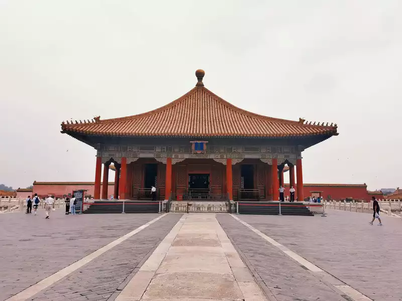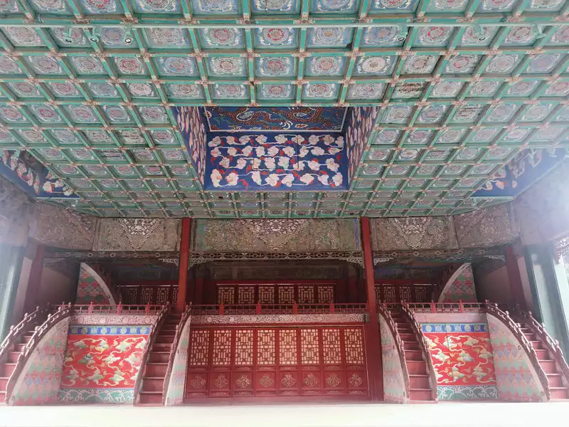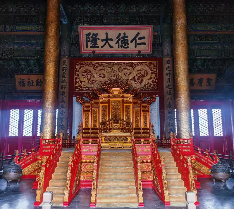 The Huangji Hall has an octagonal golden dragon caisson on the top with a throne underneath. Its rank is second only to the Hall of Supreme Harmony.