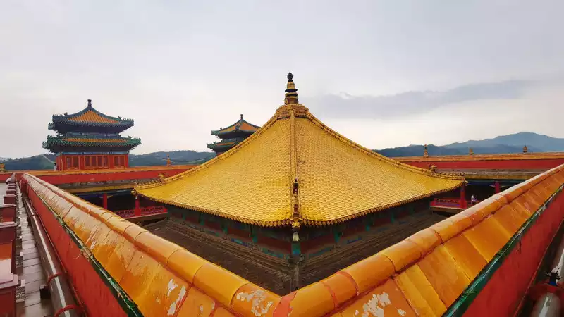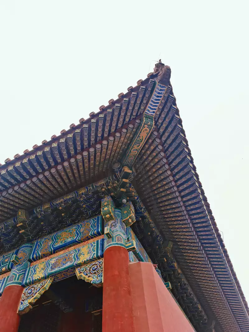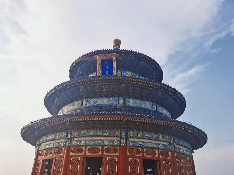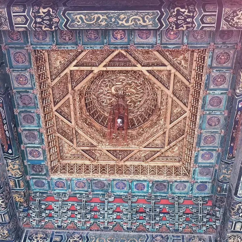 The Imperial Vault of Heaven (Huangqiongyu) is located on the north side of the outer wall of the Circular Mound Altar, facing south. It features a circular wall and three glazed doors on the south side. It was the place where the deities of the Circular Mound Altar were enshrined. The hall has no beams; the roof is supported entirely by eight outer eaves columns, eight central golden columns, and gilded brackets on both tiers of columns. The three-tiered ceiling, with its receding tiers, is a rare feature in ancient architecture. From a distance, it resembles a giant sapphire umbrella with a golden top. The hall is decorated with dragon and phoenix paintings and imperial seals. The ceiling features a gilded pattern of two dragons playing with a pearl, and the caisson is a golden dragon caisson. The spans of the brackets and caisson ceilings in the Imperial Vault of Heaven are unique in ancient Chinese architecture.