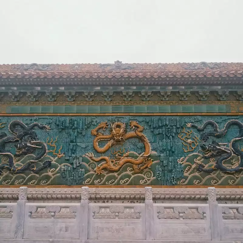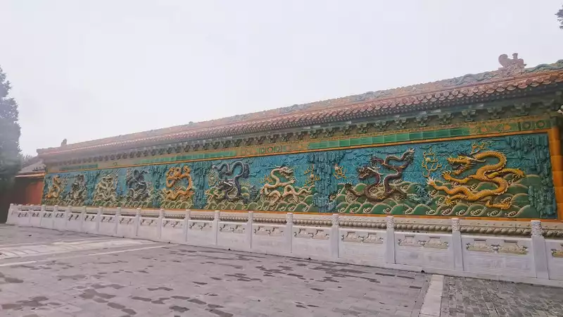 The royal majesty is displayed on the nine-dragon wall at the entrance of the Treasure Hall: