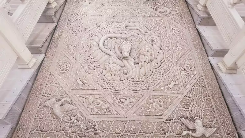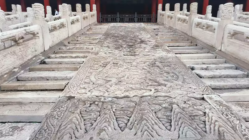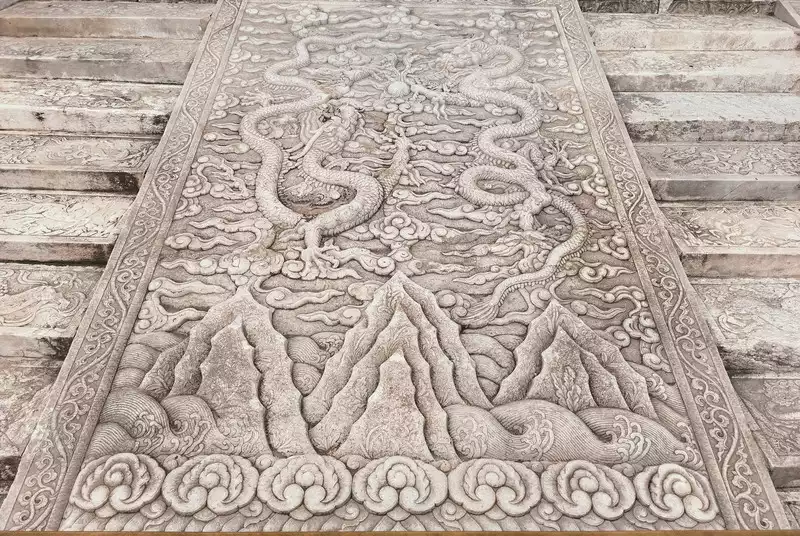 Behind Baohe Hall, the bottom piece of the stone sculpture is the largest piece in the Forbidden City, carved with nine dragons;