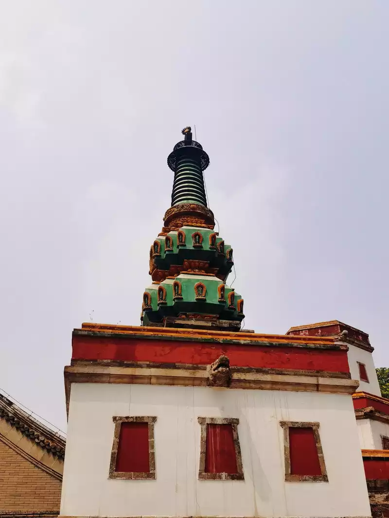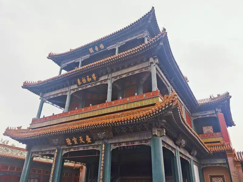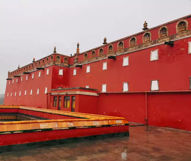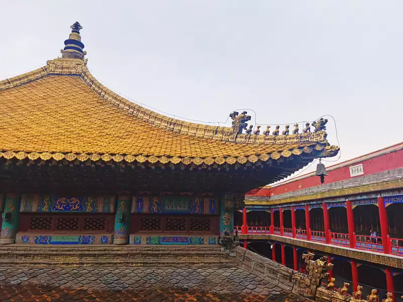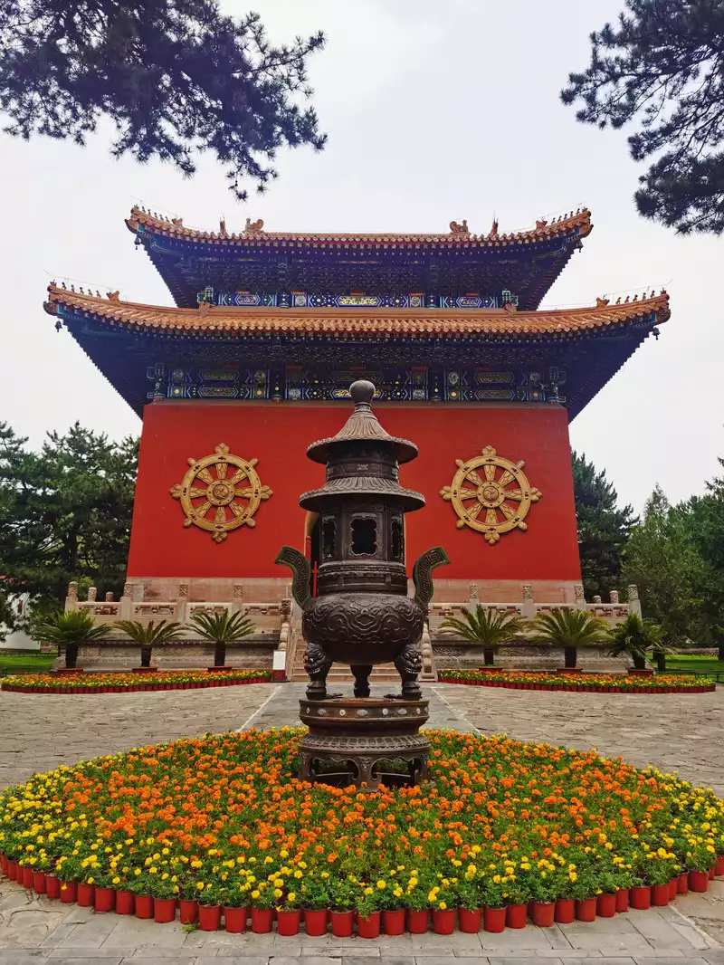 The entire temple is magnificent, covering an area of approximately 23,000 square meters. Its rigorous layout divides the main hall into two sections, the front and the back, with the main hall as the dividing line. The front section features the traditional seven-hall layout of Han Chinese temples (a galan, or temple, typically centers around the Mountain Gate Hall, the Heavenly King Hall, and the main hall, with a bell tower, drum tower, and east and west side halls symmetrically built). The back section, a Tibetan-style mandala, is modeled after the Sangyuan Monastery in Tibet, blending the two distinct architectural styles.