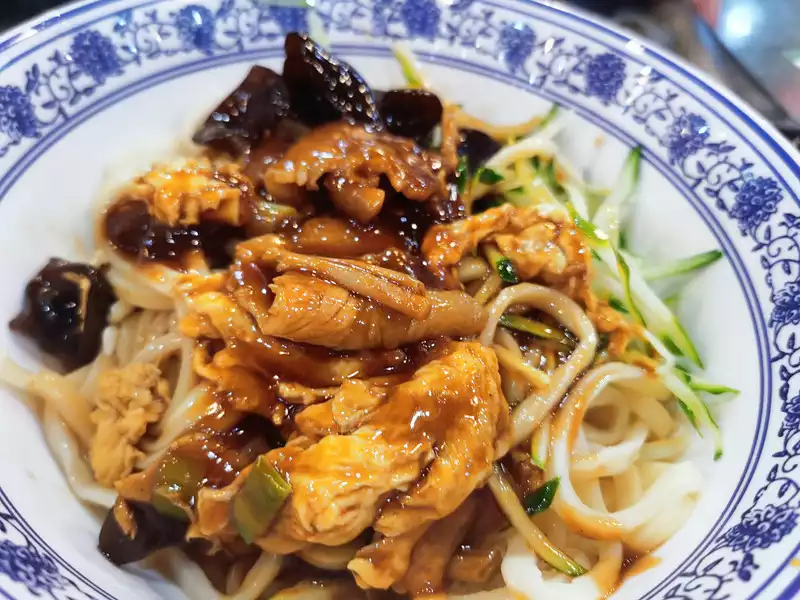 Because we had to catch a high-speed train, we didn't dare linger too long inside the Temple of Heaven. We exited the East Gate around 6:00 AM. Even then, tour groups were still entering, perhaps avoiding the rush hour. Brother Zhao took me to a nearby Old Beijing restaurant to try their famous Old Beijing fried liver and luzhu. It was a small, local spot, and business was brisk, with nearly every table occupied. In a corner, a couple of elderly Beijing men occupied two tables, eating, drinking, and chatting. One, wearing a thick gold chain and his half-rolled undershirt revealing his paunchy belly, spoke animatedly, giving off a distinctly urban vibe. We both immersed ourselves in our fried liver and luzhu. Fried liver is a famous traditional Beijing snack, a late Qing dynasty adaptation of the "white water miscellaneous dishes" served at Huixianju near Xianyukou, just outside Qianmen. Although called stir-fried liver, it's primarily made with pig intestines, with liver making up only one-third. It's not stir-fried, but boiled. First, the cooked intestines are placed in boiling broth, followed by garlic sauce, chopped scallions, starch, minced ginger, and mushroom broth. Then, the raw liver strips are added to the pot, and finally, the mixture is thickened with starch. Because it's quite thick, it requires constant stirring, giving it a distinctly stir-fried feel.