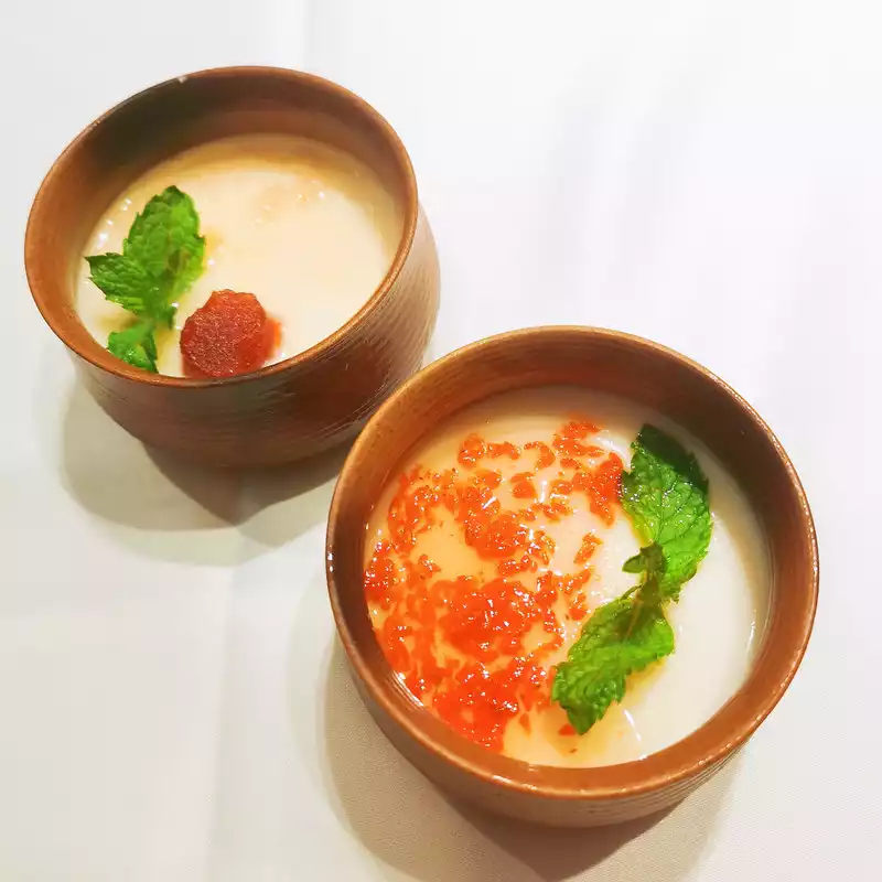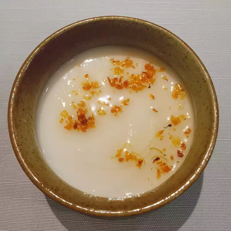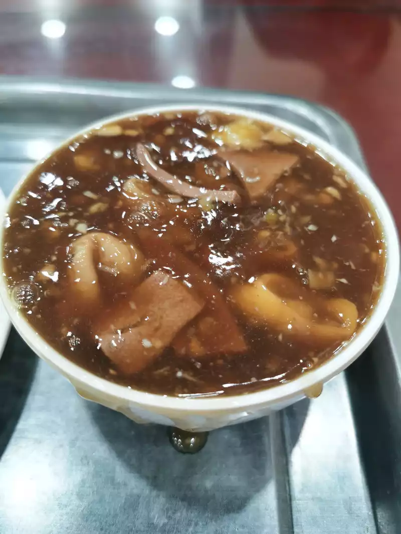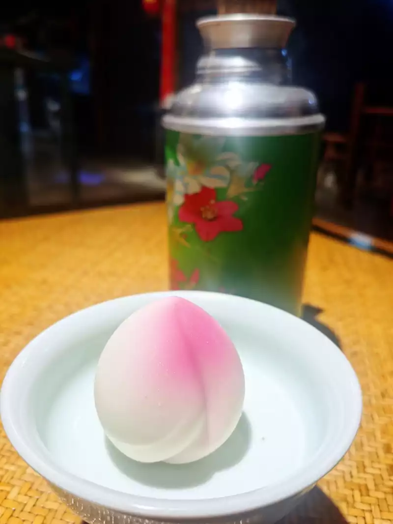 For lunch, I ordered almond tofu. It was as juicy and tender as a peach, so adorable. When I cracked open the shell, the almond tofu inside was like jelly, smooth and melt-in-your-mouth. The background of the picture below is a thermos of pear soup: