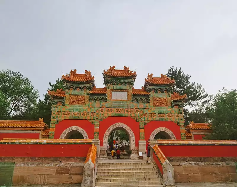 Behind the Five Pagoda Gate is a Qing-style three-bay, four-pillar, seven-story, three-vaulted archway decorated with red, yellow, and green glazed glaze. The three-arched gate is bordered with white marble. The archway comprises seven stories: a main building, a secondary building, two mezzanines, and two side buildings, all clad in yellow glazed tiles. The main building and secondary building feature hip-and-gable roofs, the second mezzanine features mezzanines, and the two side buildings feature hip-and-gable roofs on the outside and mezzanines on the inside. Each building is clad in green glazed tiles and features single-curved and single-raised brackets. The front of the main building bears the Qianlong Emperor's inscription, "Pu Men Ying Xian," in Chinese characters and its corresponding Manchu character. The rear of the main building reads "Lotus Realm Solemn." The secondary buildings each feature a yellow glazed design of a pair of dragons playing with a pearl. A platform stands in front of the archway, surrounded by parapets. Steps run along the center and to the sides, and a pair of stone elephants adorns the platform.