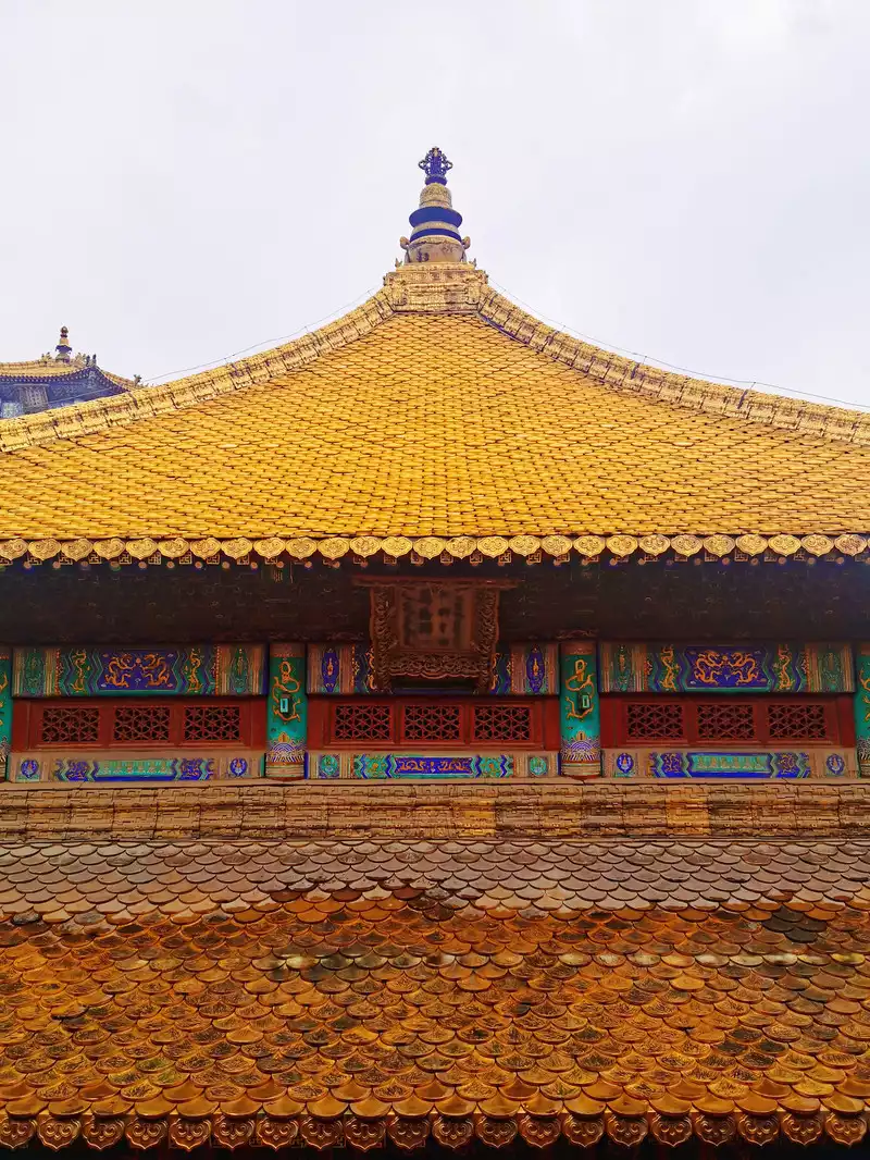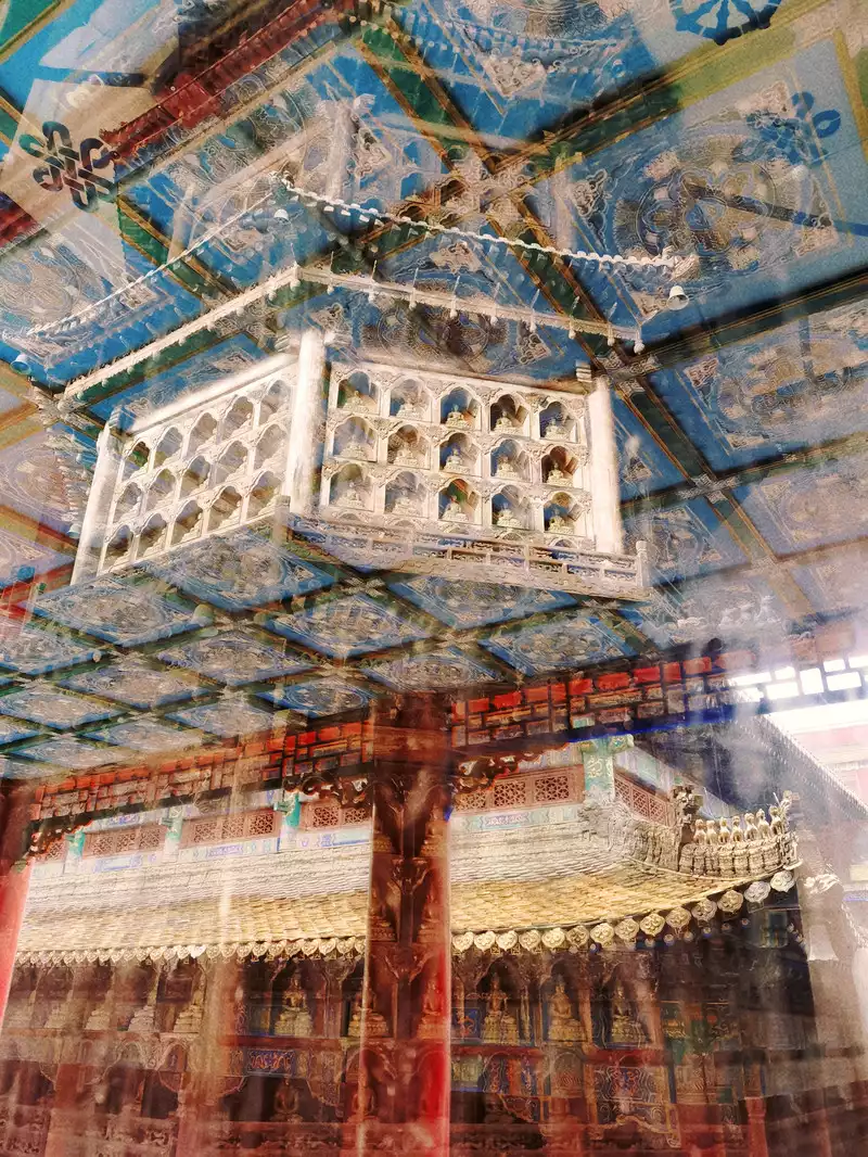 Perhaps inspired by the pure land of Buddhism, we were in no hurry to continue our journey, simply wandering the buildings surrounding the Wanfa Guiyi Hall. Looking up, we spotted a wooden Thousand Buddha Pagoda amidst the buildings. The reflected light blended seamlessly with the interior wellhead ceiling, the red-lacquered columns outside, and the gilded fish-scale tile roof across the way, creating a dreamlike illusion.