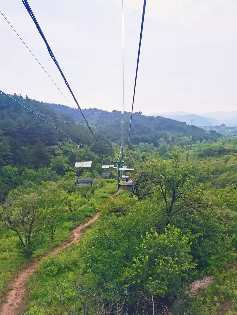 Qingchui Peak National Forest Park surrounds Chengde City, blending seamlessly with the world-renowned Mountain Resort and the Outer Eight Temples. Spanning a total area of 159,000 mu (approximately 16,000 acres), the park boasts a unique natural landscape, renowned for its Danxia landforms, showcasing thousands of dramatic rocks and towering peaks. In the scenic area, there is a tall and steep stone pillar that stands tall and reaches the sky. The stone pillar is 59.42 meters high, thick at the top and thin at the bottom, shaped like a laundry stick. Therefore, Emperor Kangxi named it "Qingchui Peak", commonly known as "Bangchui Mountain". The Qingchui Peak Cableway is currently China's longest chairlift, stretching 1,620 meters. The small white dots in the image below represent the chairlifts, though the image only shows half the distance. The entire journey takes about 20 minutes, and along the way, you can admire the Little Potala Palace in the distance and the Pule Temple up close.