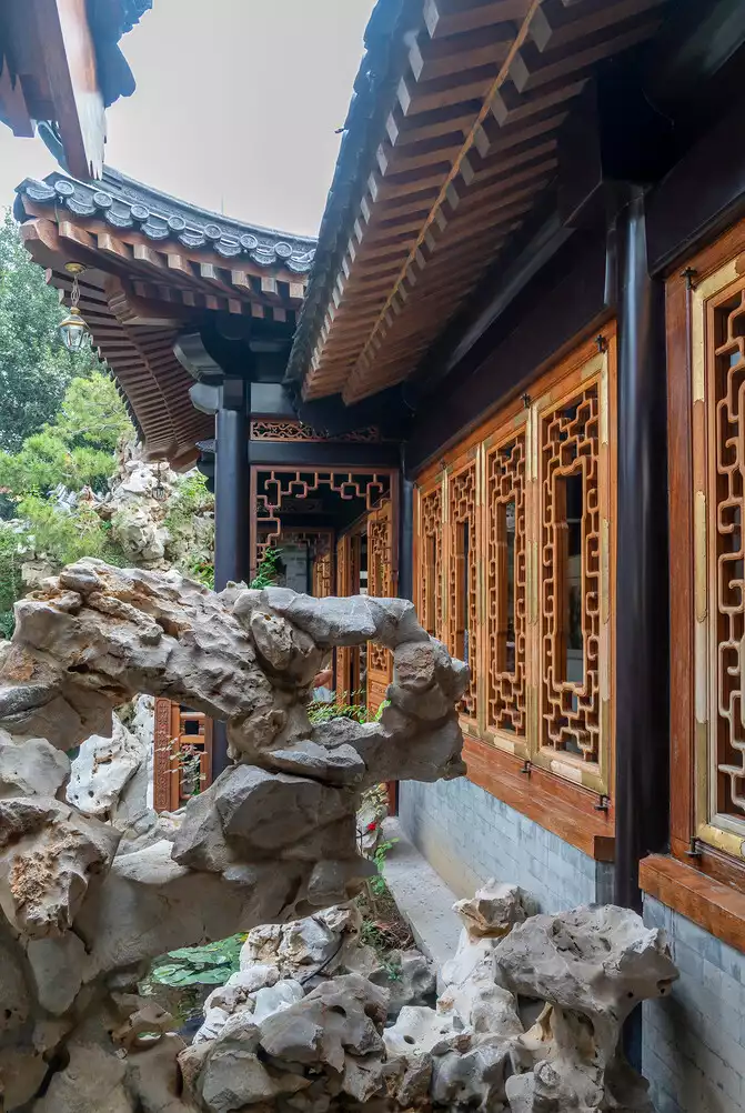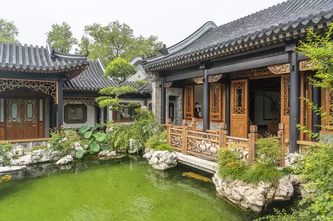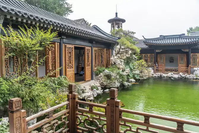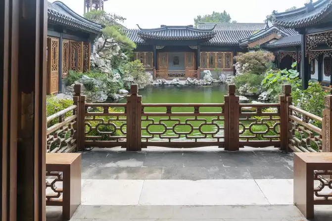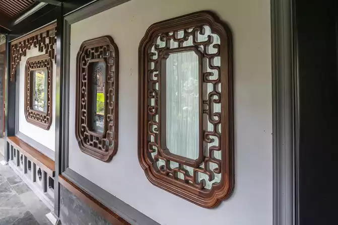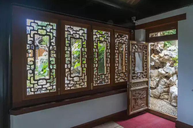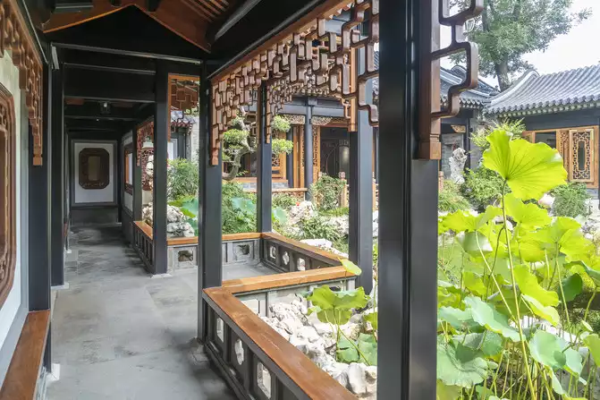 Enter and take in the entire garden. A clear pool of water lies within. According to the ancient belief that a round shape is a pond and a square shape a swamp, this should be called a fish pond. Following the Beijing courtyard style, several houses are built around the fish pond. To the north lies the main house, with wing rooms to the east, a corridor to the west, and a back house to the south. From the front, the north house is three bays wide and one bay deep. The main room features four partition doors, while the east and west side rooms have sill-walled windows. A veranda stretches to the front, and beneath the columns and crossbeams are carved wooden corbels without cloud piers. Above is a raised-beam, gray-tiled, hip roof. A gray-tiled, single-eaved, hip roof with a Qing Dynasty-style gargoyle can be seen behind. In front of the house, facing the water, stands a small white stone platform with a carved wooden staff railing. The columns, beams, and rafters are all painted black, a telling feature. The main house has a large opening, much larger than a private residence, but not as large as those in a royal palace. The pillars are painted black, unlike the red lacquer of the imperial court and the green lacquer of the royal palace. This suggests that the owner of this courtyard was probably below the provincial or ministerial level, roughly equivalent to a prefectural governor in the Qing Dynasty.