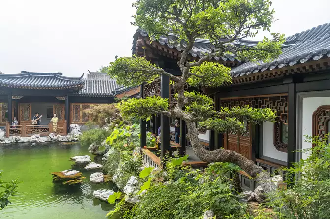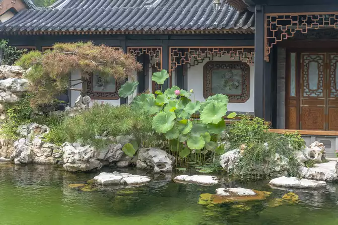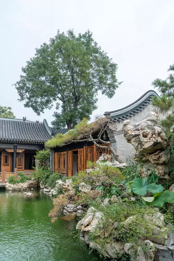 On the west corridor, there's not only an open waterside pavilion but also a small pavilion. Beside the pavilion, a tree bears unusual fruit. When asked where the fruit came from, the staff replied, "It's ornamental papaya, not edible." Seeing such a southern fruit in the capital is truly remarkable. An elegant garden cannot be without stones. There are two types of stones used in Chinese gardening. One is the Taihu rocks mentioned above, which are piled up to create a mountain landscape. The other is flat stones, which are also stacked to create a mountain landscape. This garden features both types of stones, either piled at the corners of the house or stacked in the water. The most majestic thing is a mountain range in the southeast.