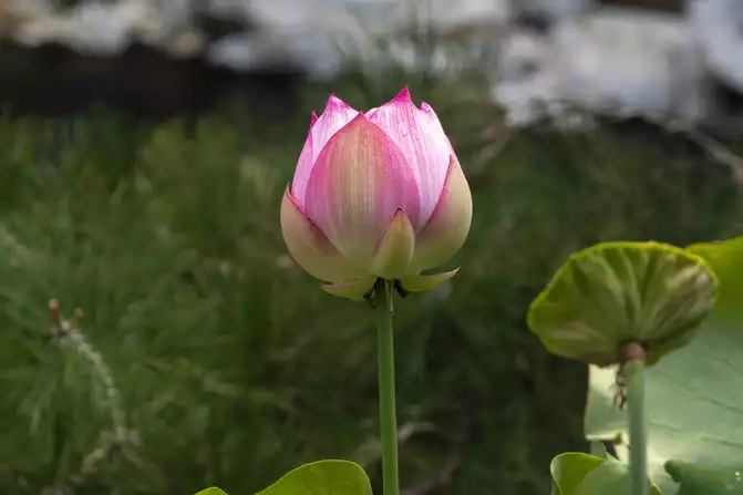 As summer fades, the late lotus leaves stand alone beside the pond. Their solitary beauty, unadmired by itself, often draws pity and admiration from visitors.