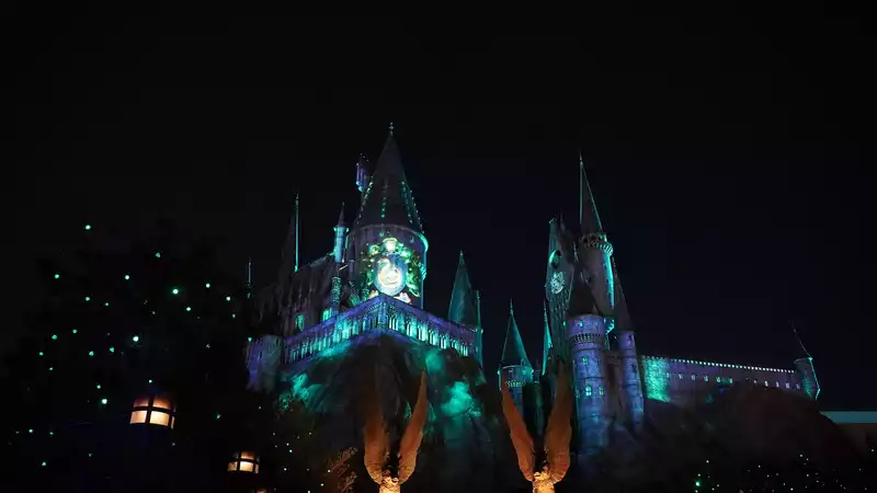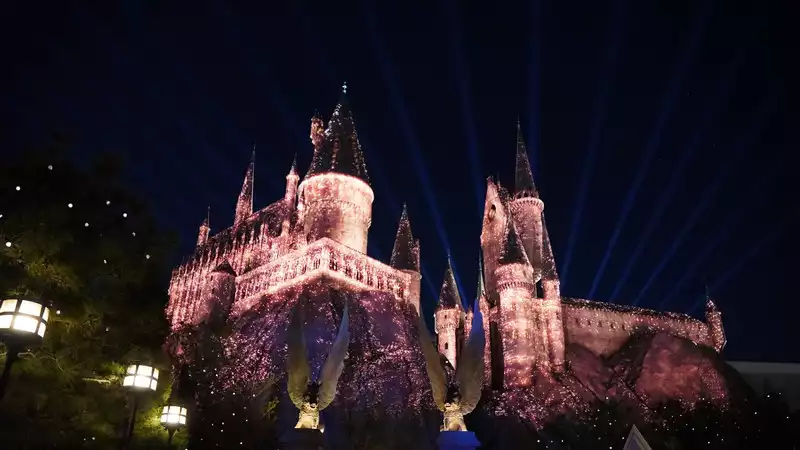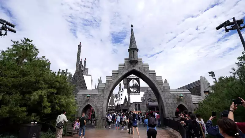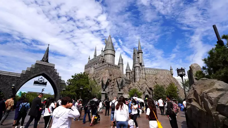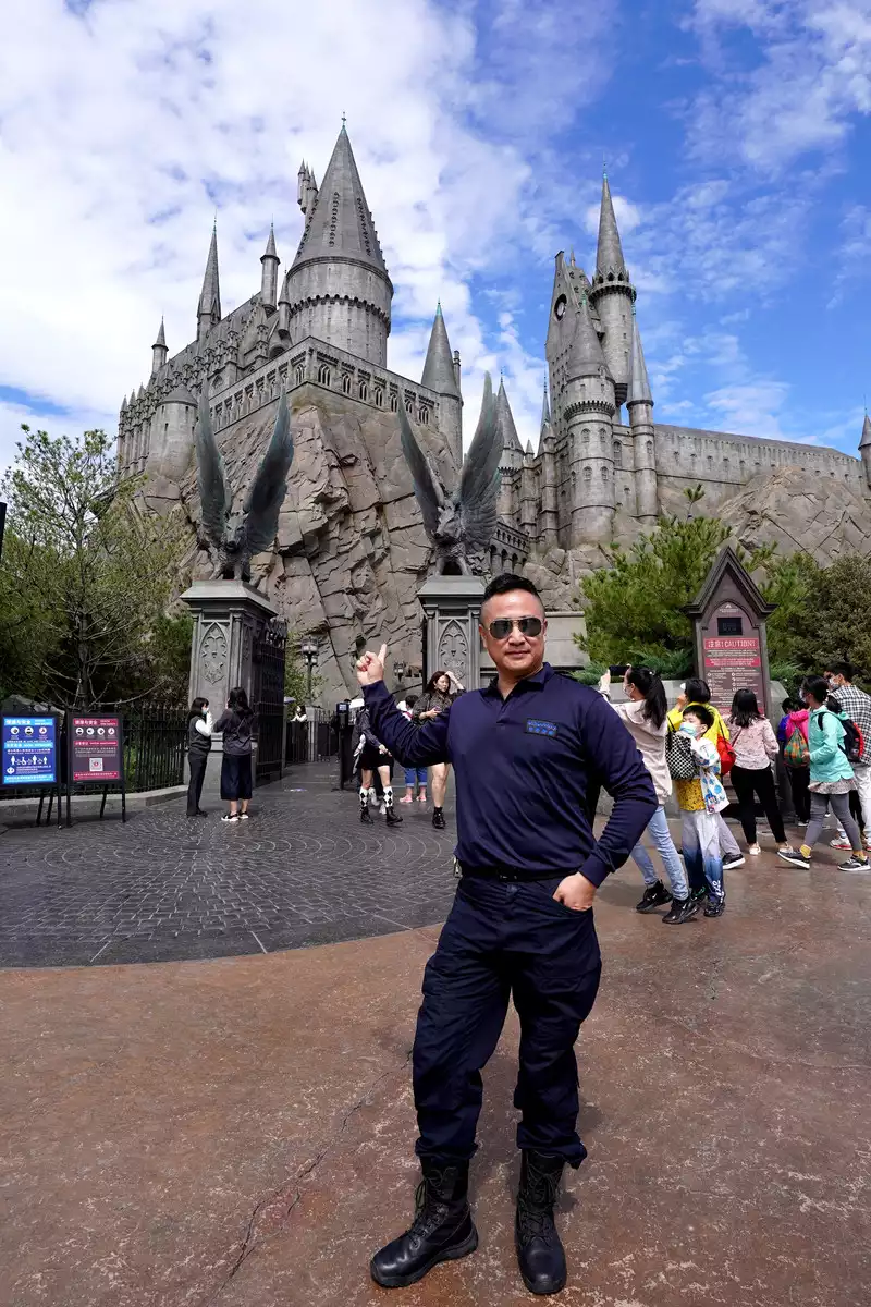 The seats are also color-coded: blue for soaking wet, green for semi-wet, and red for not wet. But aside from the front and center, the rest of the area isn't too wet! Raincoats are available for sale for $60, but you don't really need to buy them. If you're looking for a thrill, you can sit in the front row, interact with the staff, and receive a unique water-splashing welcome. Having previously experienced it up close at Universal Studios Hollywood, I skipped the lines this time. Besides the stunts, there are also unique themed dining and entertainment experiences outside the venue. The Wandering Beats band's performance was also fantastic, incorporating various elements, including percussion instruments, into the live music. The most anticipated theme park for fans - enter the Wizarding World of Harry Potter.