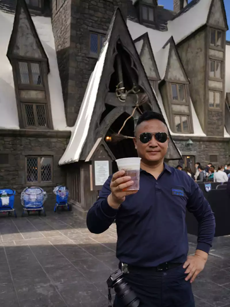 After a bit of fun, you can dine at the Three Broomsticks restaurant or try on Butterbeer. Butterbeer is a must-try at Universal Studios Beijing these days, as it's a popular drink from the Harry Potter films. Can you imagine the joy of sipping Butterbeer and eating barbecued ribs at the Three Broomsticks at Hogwarts? Be sure to eat outside, right next to the Black Lake and the castle! Butterbeer is available at two price points: 50 yuan for a regular glass, and 80 yuan for a special glass, available with or without ice. The regular Butterbeer is the best, but it would be even better with the salty milk cap. After a satisfying meal, enjoy a performance by the Frog Choir, a chorus of Hogwarts students and frogs. There's also a pep rally for the Triwizard Tournament, where the handsome men and beautiful women are a real treat. Standing at the heart of the park, Hogwarts Castle stands 47 meters tall, the second tallest building in the park. Entering this enigmatic structure, you'll leave the Muggle world behind and transform into a wizard. At night, the highlight is the Hogwarts Castle Night Lights Celebration. Dusted in dazzling starlight, the four houses, including Llyffindor and Hufflepuff, are illuminated by magical lights to the backdrop of classic music. The lights and shadows on the castle change with the music, showcasing the four Hogwarts houses in their respective styles. The magical colors and dazzling lights add a touch of mystery to the towering castle. I highly recommend you and the whole family come back here for another magical visual feast in the evening!