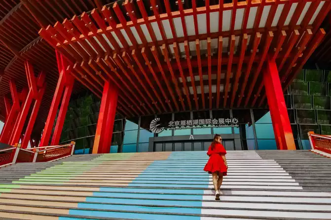 When the fugitive princess leaves her castle, the last place she wants to check in is Yanqi Lake. It is said that the most iconic building in Yanqi Lake is this vermilion building. The top is designed as a disk that gradually enlarges upward, like the reflection of the Temple of Heaven. This is the Beijing Yanqi Lake International Convention and Exhibition Center.