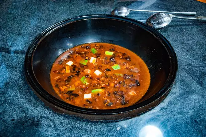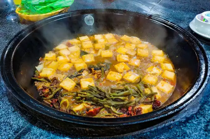 The sauce is rich in flavor. Freshly killed live fish are stewed in a large firewood pot. This delicacy is unique to Miyun.