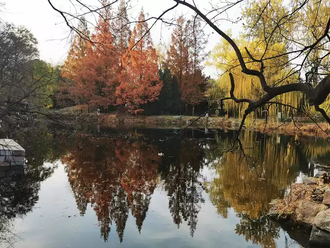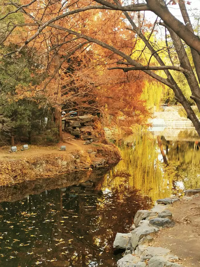 We arrived in the afternoon and arrived at the Seventeen-Arch Bridge just as the sun was setting. The golden light streaming through the Seventeen-Arch Bridge is truly a sight not to be missed. You can see it any day as long as the sun is shining, but definitely in the afternoon, as the sun sets. Back Lake is a perfect place to enjoy the autumn scenery. After crossing Suzhou Street, walk along the shore of Back Lake, where the lake's banks are a vibrant blend of red and yellow.