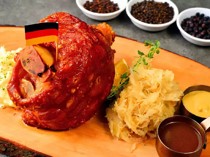 It's worth noting that Blomberg's culinary tradition is rooted in traditional German cuisine. Among these, the following three dishes are particularly noteworthy. The popularity of German cuisine perfectly embodies the essence of "big chunks of meat and big gulps of wine." Dishes like German Crispy Roast Pork Knuckle are Blomberg's most frequently ordered items. The 1.5kg pork knuckle is marinated, steamed in a steamer for four hours, and then baked in a high-temperature oven for 30 minutes. The freshly baked pork knuckle is golden and crispy on the outside, and tender on the inside.