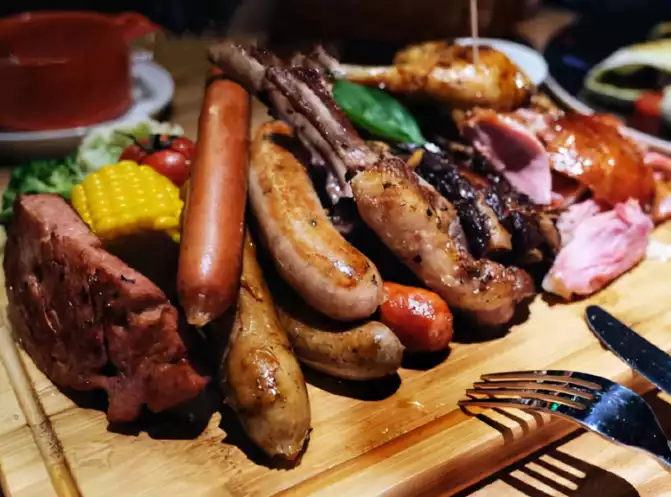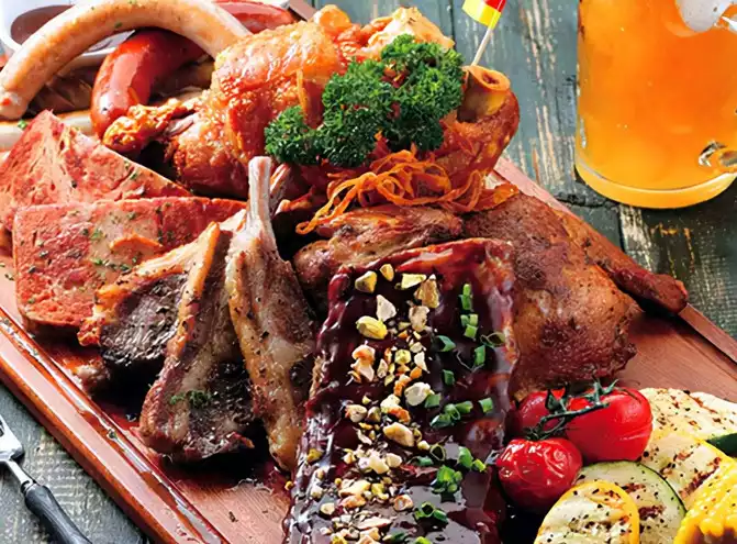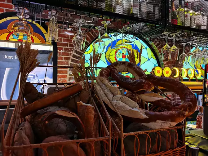 The wheat glass, handleless and thin, features a threaded body. It's specifically designed for beer primarily made from wheat malt. The barley glass, commonly known as the pineapple glass, has a handle and is specifically designed for beer primarily made from barley malt. The threads on both the wheat and barley glasses prevent hand warmth from being transferred too quickly to the beer, which would cause the beer to heat up and affect the taste. The charm of craft beer, commonly known as fresh beer, lies in its active yeast. Active yeast typically thrives in a temperature range of 1-3 degrees Celsius. Higher temperatures reduce yeast activity, eventually turning it into dead yeast, affecting the taste. As they spoke, a vibrant and appetizing salad of vegetables and seafood, along with a variety of sausages, arrived. The food at Blomberg Bistro is truly unique. Its signature dishes have long garnered countless adoration, including the Crispy Roast Pork Knuckle, Bavarian Sausage Platter, Roast Spring Chicken, Tuna Salad, and the 'Swap Bread,' all highly acclaimed by diners.