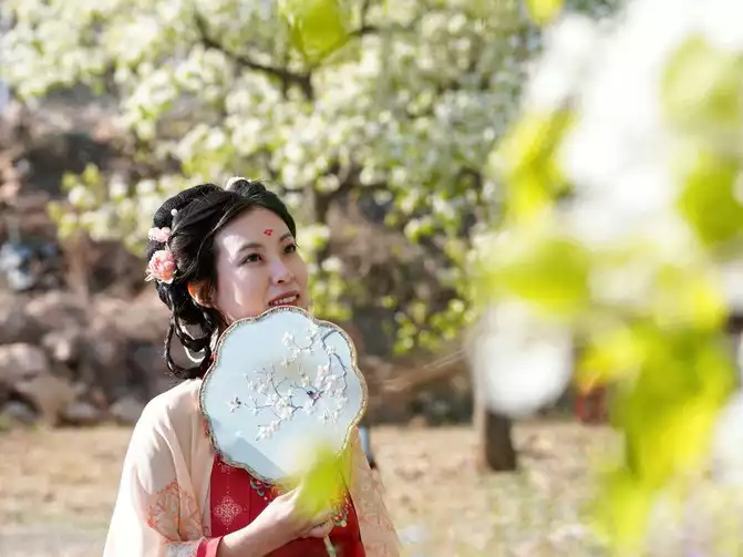 The photos taken here are very grand. The scenery is so beautiful that there is no need for post-processing. The original photos can be posted directly on WeChat Moments. You can stand by the stone bridge or the roadside with the mountains as the background and you will have great photos. At designated times every day, there's a peacock release performance. With the sound of a long, melodious whistle, peacocks fly out in formation from the depths of the mountains, one after another spreading their wings and soaring down to the valley floor... Children can also have an intimate "encounter" with the peacocks, feed them, and admire the beauty of this king of birds up close. We rode the train through the dense, cascading pear blossoms to the foot of the mountain. From afar, the pear trees looked like fountains bubbling from the ground. The snow-white pear blossoms, like a continuous stream of waves, danced and leaped in the sunset, caressed by the spring breeze, their whiteness as pure as snow and shimmering silver. From afar, the pear blossoms, like drifting white clouds or scattered snowflakes, are infinitely soft and charming amidst the majestic mountains, a breathtaking beauty. The sky is a rosy red, and in the twilight, the che shenjia and fellow Hanfu dancers dressed in costumes from different dynasties form a beautiful painting. Their graceful figures, some gently waving round fans, some holding umbrellas, seem to have stepped slowly from the painting across millennia.