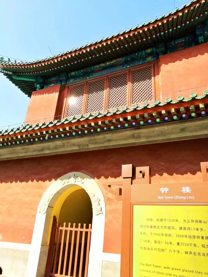 The bell tower is square in plan, with a double-eaved, green-glazed tiled hip roof. The bell is inscribed with the characters "Made in the Jiajing Period of the Ming Dynasty," and its tone is resonant and powerful.