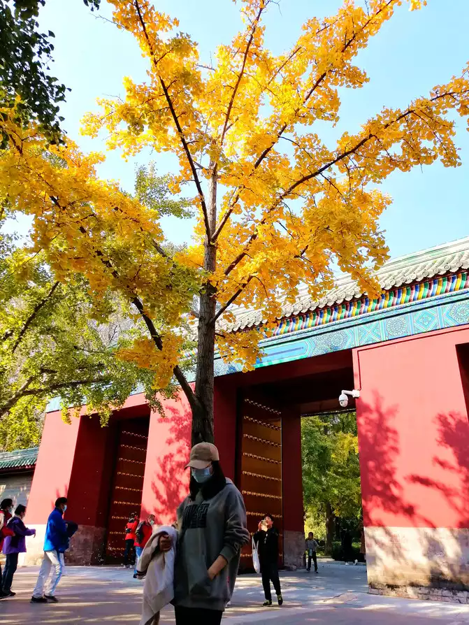 Ditan Park has a Ginkgo Avenue, with over 200 sturdy and tall ginkgo trees, most of which were planted in the 1950s. Despite its name, the road is neither very wide nor very long. I came too hastily. I should have come in late October. I looked away and scanned the forest covered in autumn leaves. I unexpectedly discovered several persimmon trees. They were already bearing persimmons, which would be ready for consumption in the coming days.