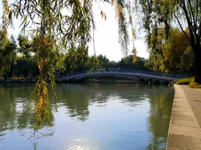 After crossing the bridge, you will reach the island in the middle of the lake, surrounded by willow trees. On the other side of the island is another white stone bridge, leading to the other bank. From a distance, it resembles the twin bridges of West Lake.