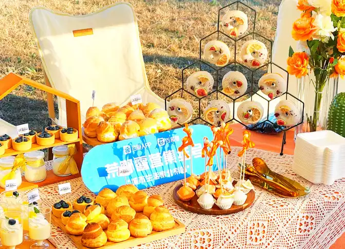 At 1:00 p.m. on October 21, 2021, we took a bus from Zhichun Road Metro Station to Huabin Manor in Changping District, Beijing. We arrived at our destination an hour and a half later. The manor is located at the foot of the Great Wall. We camped on the open grassland of the manor. Everyone worked together to set up tents, set up dining tables, put chairs, and place various cakes and drinks.