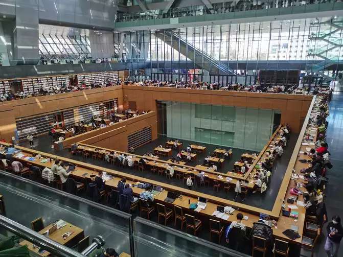 The Yongle Encyclopedia exhibition. Unfortunately, only one in a hundred pieces of the encyclopedia remains, making it extremely precious. It was almost 1pm when I came out of the Classic Library. Before leaving, I stopped by the library in the North Building. The inverted pyramid-shaped library has a novel design and there are many more people reading books than visiting the exhibitions.