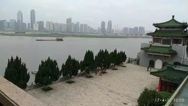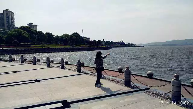 The Yueyang Tower has only three floors, but because it is built on the city wall, it still looks tall and majestic. From the tower, overlooking the lake and sky, I see two different colors. Dongting Lake, seen from here, has a yellowish hue, seemingly not very deep. From the city wall, I saw a sharp demarcation between the blue Yangtze and the lighter Dongting waters at the confluence of Dongting Lake and the Yangtze River. And last night, from Baling Square, I saw Dongting Lake still surging and majestic. The scenic area includes Nanhu Lake and Nanhu Square. Nanhu Lake is a tributary of Dongting Lake; Nanhu Square, built along the Nanhu Lake, is the largest square in Hunan Province.
