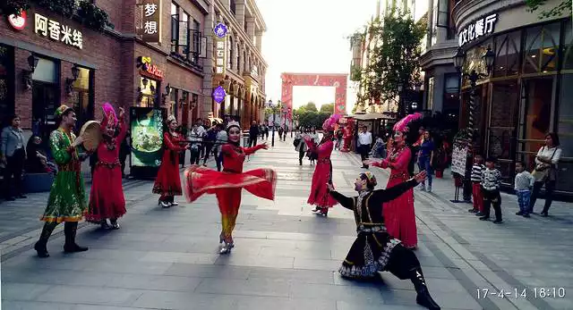 A Xinjiang girl dances gracefully in front of the Xinjiang Culture Restaurant on Han Street.