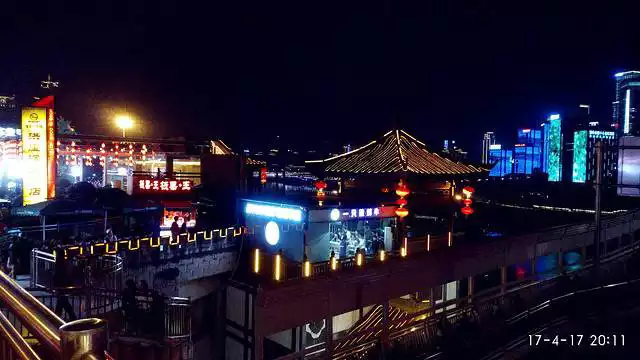 Chaotianmen is one of Chongqing's ancient city gates and the largest water wharf in Chongqing, marking the estuary where the Jialing River meets the Yangtze River. Above Chaotianmen is Chaotianmen Square, which, from a distance, resembles a giant ship, earning it the nickname Chongqing's Titanic. From Chaotianmen Square, you can see the distinct confluence of the yellow Yangtze and green Jialing Rivers, creating a unique spectacle. To the left of Chaotianmen lies the Jialing River. From Chaotianmen Square, the Qiansimen Jialing River Bridge is magnificent. The sight of the two river cruise ships and the scenery along both sides of the Jialing River together create a stunning night scene at Chaotianmen Wharf. This is the night view of the Yangtze River and its banks to the right of Chaotianmen. On our way back to the hotel that evening, we passed Jiefangbei Pedestrian Street, a bustling commercial street. Day 9, Chongqing (April 16th) Huguang Guild Hall, originally built in 1759 in the auspicious Dongshuimen area, was built by people from Hunan and Hubei to connect with their hometowns. This exquisitely decorated building is the largest ancient guild hall complex in China. It is located in the Dongshuimen area. The Dongshuimen Bridge passes through the north side of the guild hall.