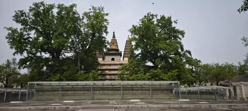 After passing through security and entering the museum, you'll see the Vajra Pagoda nestled on the central axis of the courtyard. Two century-old apricot trees stand to the left and right of the pagoda, their dense branches and foliage obscuring the pagoda's entirety. This partially obscured presence adds to the enjoyment of viewing the pagoda. It's spring now, and the apricot leaves are vibrant green. Strings of tiny green fans hang upside down from the branches, filling the two apricot trees on either side. The wind rustles these little fans, swaying the branches and leaves with a gentle rustling sound like the waves, swaying with the sound of spring. For centuries, spring has passed through the pagoda like this, touching every brick and stone. Believers walk clockwise around the pagoda, silently reciting Buddhist scriptures. Whether with a wish or without, they clasp their hands together and circumambulate alone. Whether with a mind or without, they silently recite a thousand words to accumulate merit.