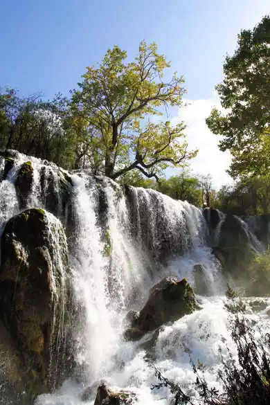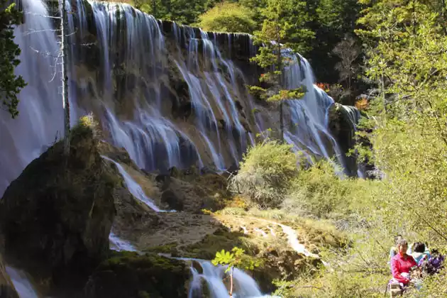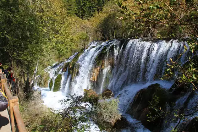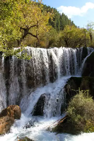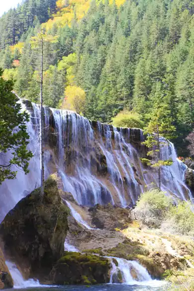 divided into thousands of water bundles by the trees in the water, and finally gathers on the cliff side at the top of the waterfall