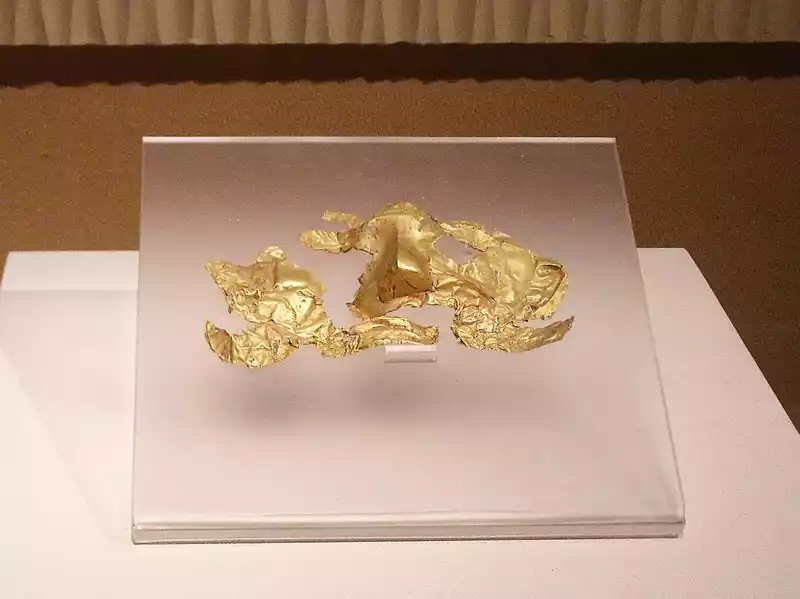 Bronze head wearing a gold mask. Shang Dynasty bronzes. The gold mask is pounded into gold skin with gold nuggets, and then according to the shape of the avatar, the forehead is level, the chin is covered, the left and right sides are covered with ears, the earlobes are pierced, and the eyebrows are hollowed out. According to analysis, the adhesive method is to use raw lacquer and lime as the adhesive and attach the gold mask to the head.