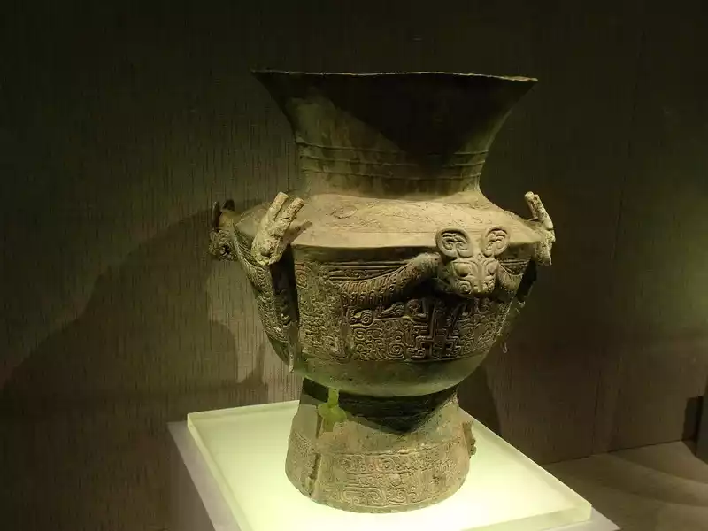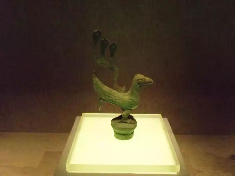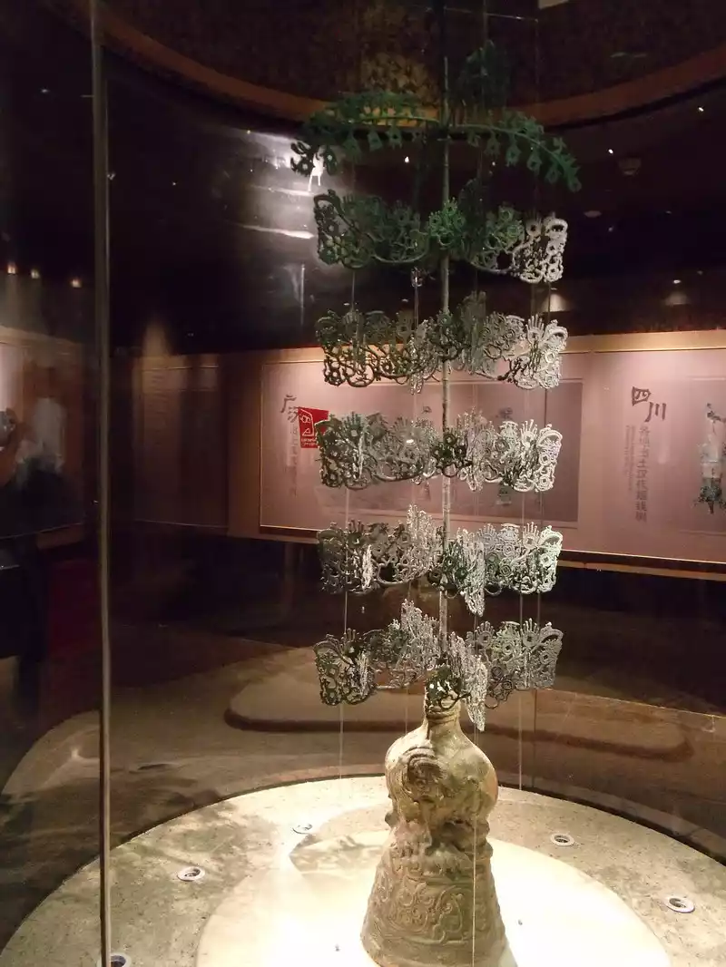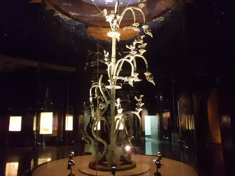 Bronze Sacred Tree. Bronzes from the late Xia Dynasty, the first batch of cultural relics prohibited from being exhibited abroad. It is 3.96 meters high and has a trunk balance of 3.84 meters. There are three layers of branches, and the flowers and fruits of the branches are either upturned or drooping. On the tree stand nine sun god birds. There is a dragon hanging in the lower part, with the dragon's head facing down and the tail on top, enchanting.