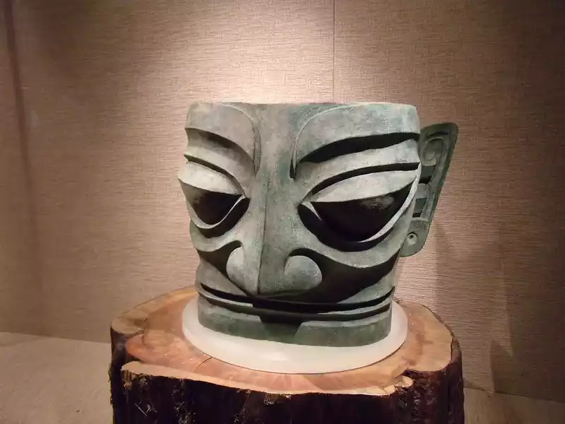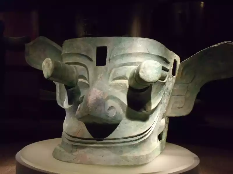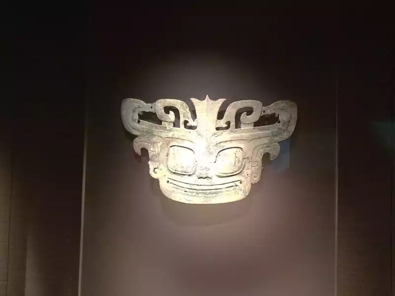 Bronze longitudinal eye mask. It is 1.38 meters wide and 0.645 meters high, and its eyes are columnar and convex outward. A pair of carved ears are fully spread out to both sides, with a majestic shape and majestic four instruments, which is the earliest and largest bronze mask in the world.
