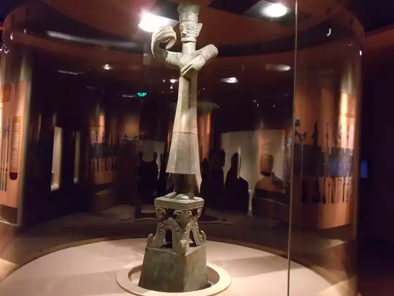 Sanxingdui Museum is located in Guanghan City, Deyang, is a Shu cultural site from the Neolithic period to the Shang and Zhou dynasties, and the treasures of the town hall include bronze sacred trees, bronze longitudinal masks, bronze Dali people and other cultural relics. The name of Sanxingdui comes from three huge loess mounds on the plateau on the south bank of the Mamu River in the west of the city, undulating and connected, looking like stars in the sky.