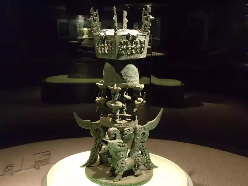 Bronze altar. It is divided into four floors, the bottom floor is the beast-shaped seat, which is the pedestal of the entire altar; the second floor is inhabited by four Dali people; the third level is high mountain; The top layer is the most mysterious, it seems to be a square box with five ancient Shu people carved in it.