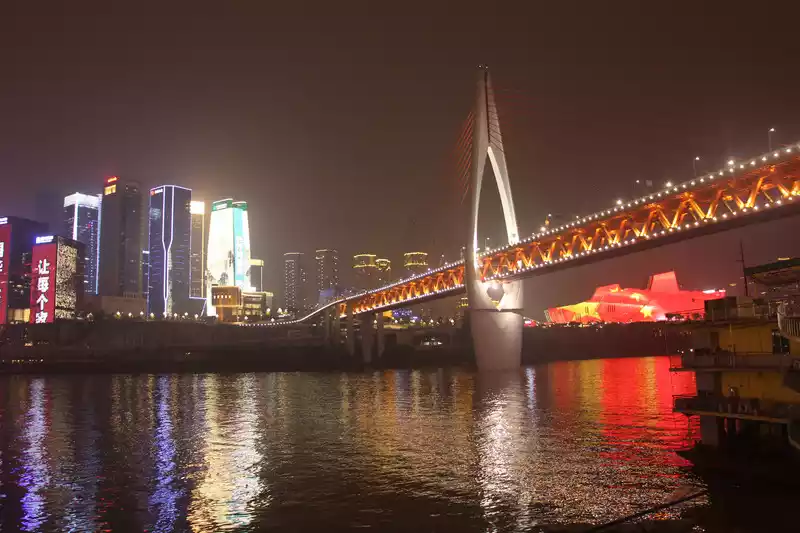The night view of Hongya Cave can be said to be one of the best. On the one hand, the lights of Hongya Cave are brilliant, and on the other hand, the Qiansimen Bridge floats on the Jialing River.