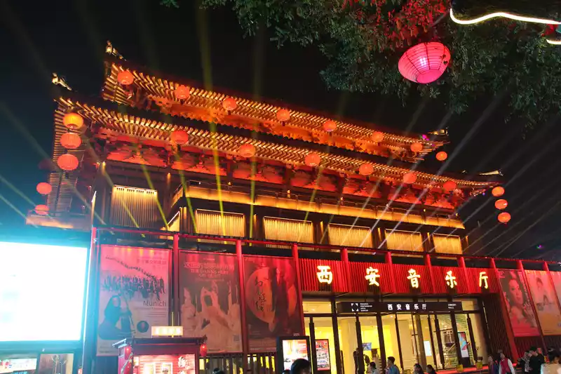Yongxingfang is near the east gate of the Xi'an city wall, and you can see this area of lights and wine on the city wall at night.