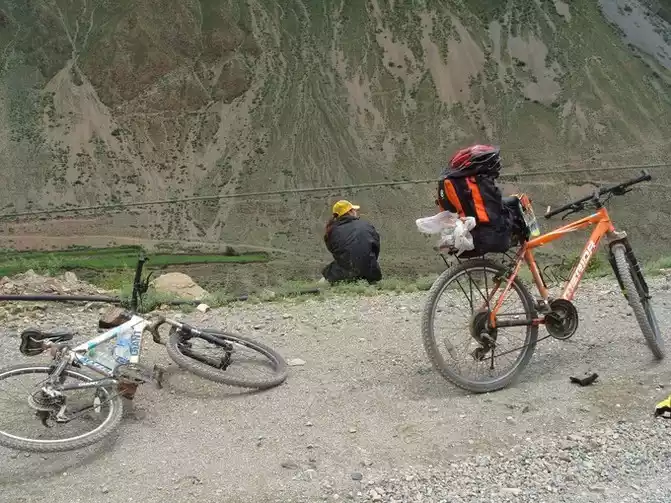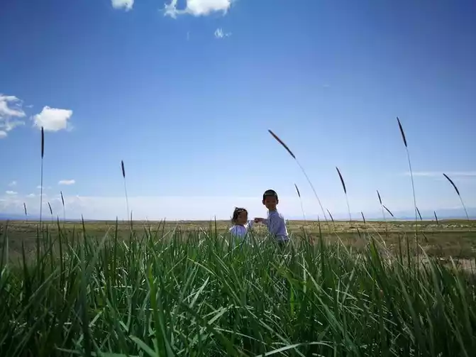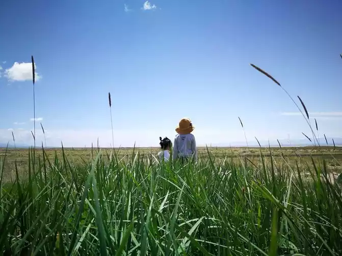 the meadow by the Chaka Salt Lake, I found a hiking guy setting up a tent here and saw a hare running around.