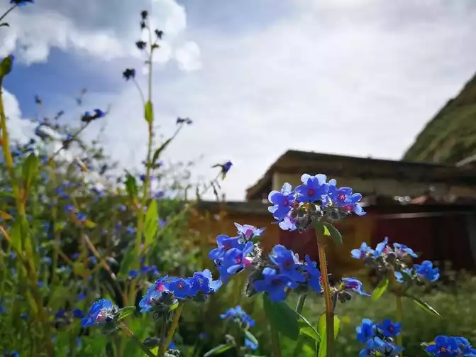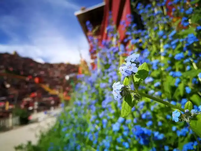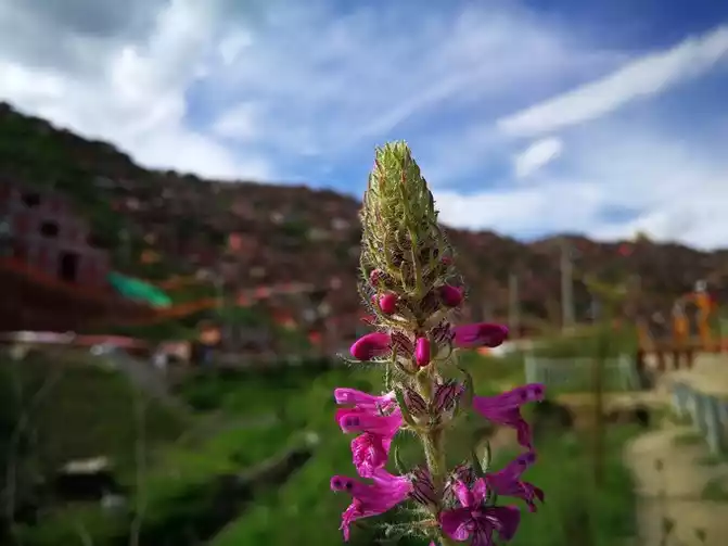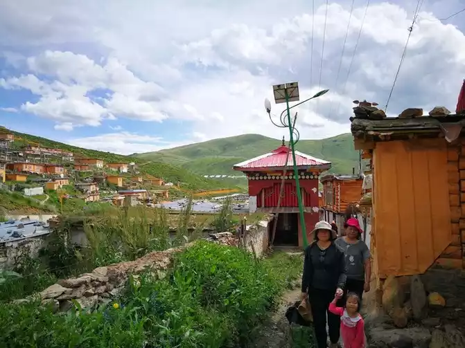 The flowers of Seda are warm and free, living alone, unable to understand the scriptures or see people. One flower, one world, it's good. The old dog and the old cow here cannot be called brothers, just like tourists and monks, they are all in the same world, not in the same world. The little girl drying the quilt, touching the old cow, and feeding the old dog are the only maintenance of their relationship.