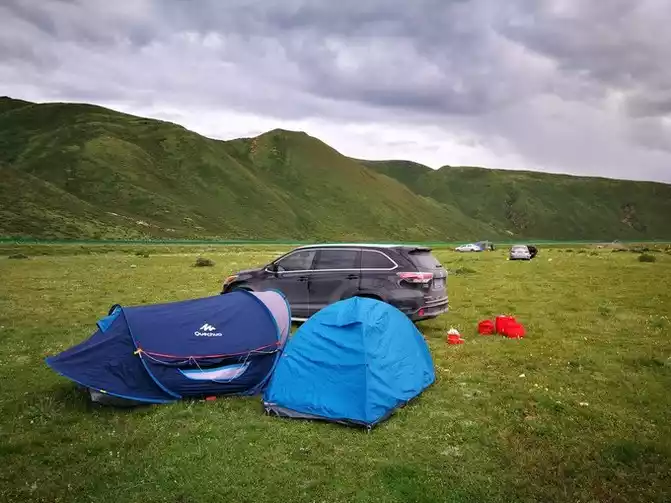 Camping in the evening on an open grassland outside Seda. At first, Tibetans had picnics here, and there were also college students who rented cars from Chengdu to take the 318-214 Small Ring Road.When the students saw our family coming, they asked us if we were camping here for the night, and I said yes, they were very happy and said that it was more secure to have us as companions. There were four people in total, and one or two female classmates, who didn't prepare tents or anything, so they opened the window a little and slept in the car.
